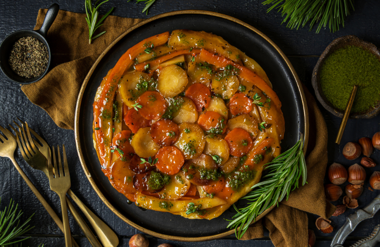- Line a 26cm tin or ovenproof pan with a sheet of parchment paper. Place the caramelised carrots and parsnips on top of the parchment, removing the whole garlic clove and sprigs of thyme. Arrange the carrots and parsnips neatly for a nice presentation once cooked.