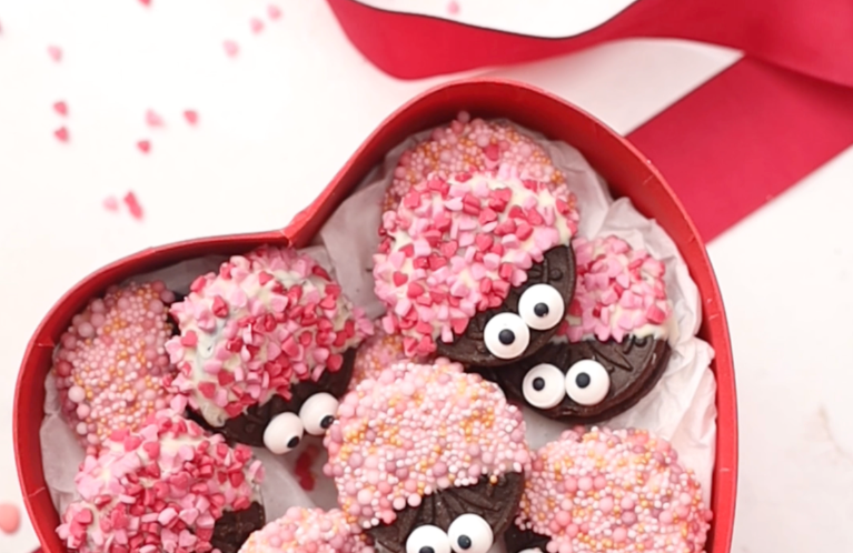 - Dip roughly half the Cookie Creams into the melted white chocolate, dipping about two-thirds of each Cookie Cream. Place each one onto the prepared tray, and sprinkle with sprinkles to decorate.
