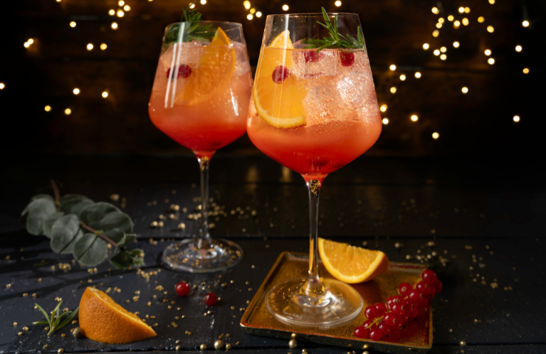 - Stir before serving and garnish with an orange slice and a few frozen cranberries.