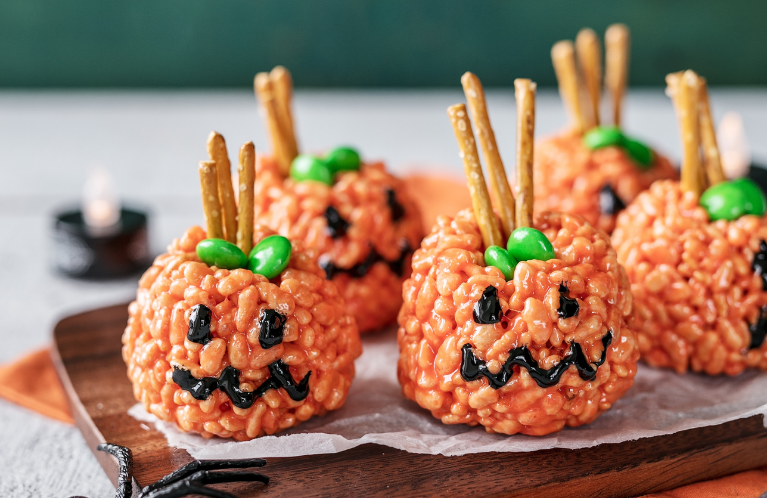 3. When cooled, shape the mxiture into balls, then insert three pretzel sticks into the top for the stem. Use a wooden skewer to shape the ball to resemble a pumpkin. Add a green M&M to the top for the leaf.