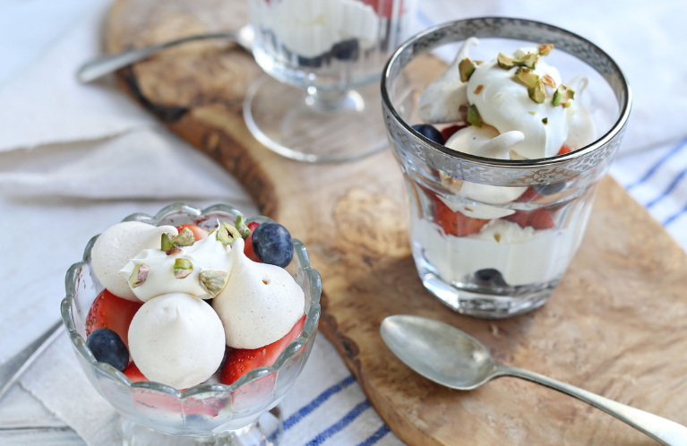 - Serve in elegant glasses, layering up the meringues, cream and berries in the glass. Top with a dollop of fresh cream and a sprinkle of crushed pistachio nut. Store leftover meringues in an airtight container, lined with a sheet of kitchen paper (to draw moisture away) and they should keep for up to a week.