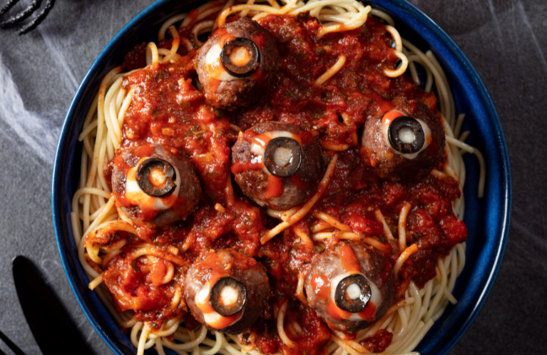 - Meanwhile, cook the spaghetti according to package instructions. Warm the tomato sauce in a small pot. Stir the spaghetti and the sauce together and divide amongst four dishes. Top with the spooky eyeballs and serve immediately.