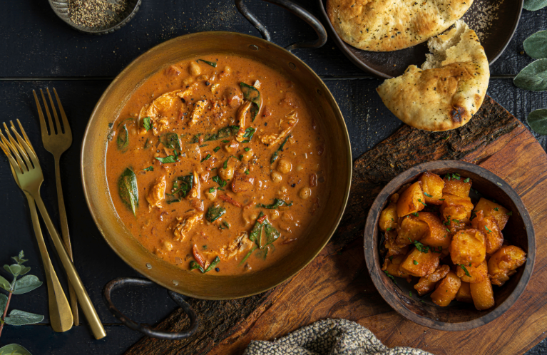- Serve the curry alongside the Bombay potatoes with a scattering of leftover fresh parsley on top and naan if desired.