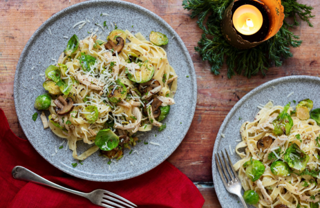 Creamy Turkey, Mushroom and Brussels Sprouts Pasta