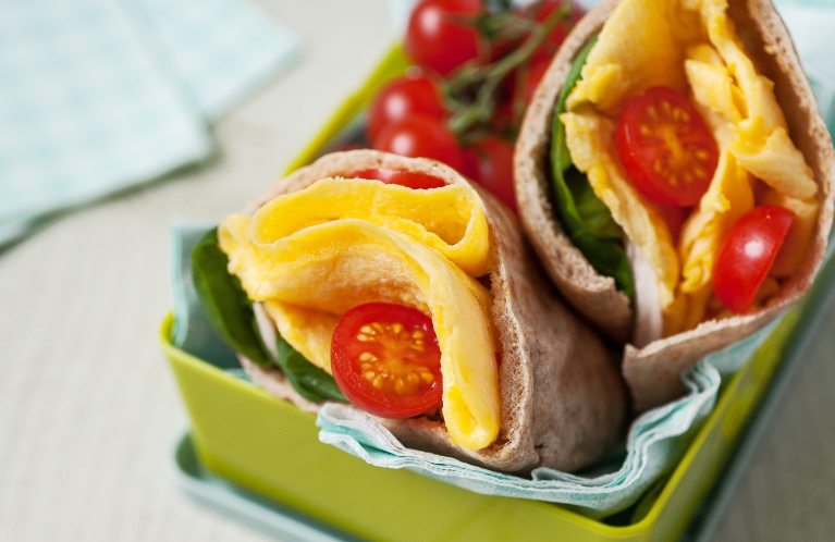 - Fold the omelette in half and then in half again. Stuff the omelette inside the pitta, adding some baby spinach leaves, chopped tomatoes or a slice of ham or turkey if desired.