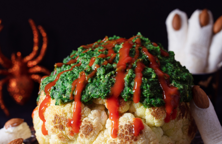 - Once the cauliflower has cooled, use a sharp knife to carefully cut a hollow, creating a bowl in the top. Fill this with the green hummus. Mix the ketchup with a little warm water and drizzle over the sides of the cauliflower to look like blood. Serve the cauliflower brain with the dead man’s fingers on the side for dipping.
