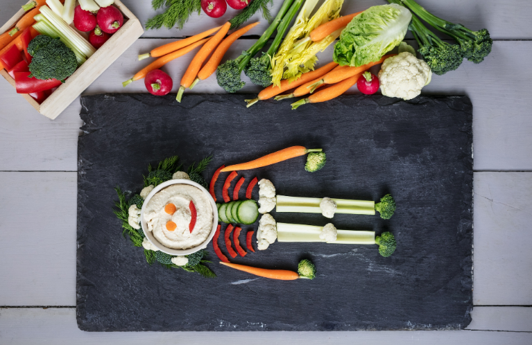 - Place the hummus into a small bowl for the head. Use cauliflower and broccoli florets for the hair. Cut eyes out from carrots and a mouth from a red pepper.
