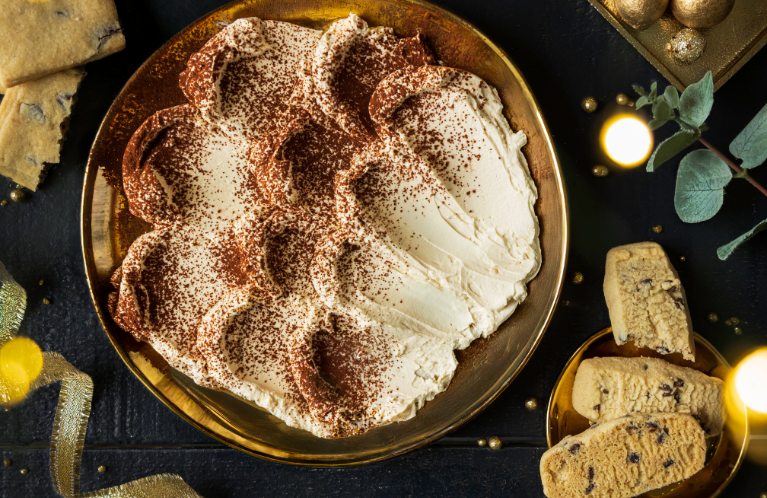 - Using an spatula, spread the coffee mascarpone mixture onto your serving board. Sift cocoa powder on top and serve with an array of biscuits – biscotti offer a lovely festive, Italian touch, while shortbread and biscoff might be more popular choices if you’re feeding a crowd!