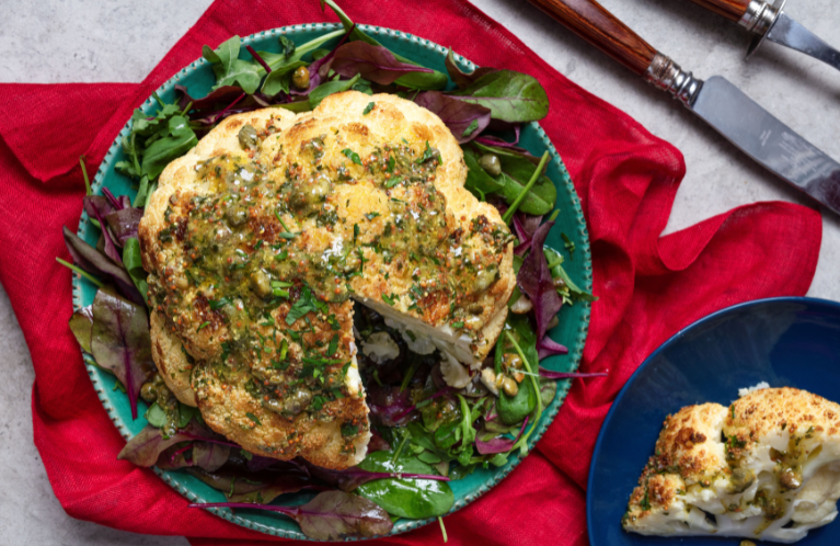 6. For the dressing, whisk together the lemon juice, mustard, capers, parsley and salt in a small bowl, then whisk in the olive oil. Drizzle the cauliflower with the dressing and serve in big wedges.